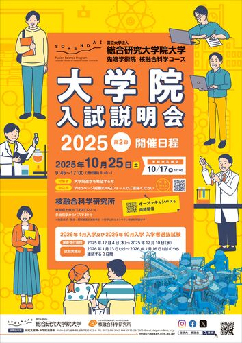Orientation for the Entrance Exam. 2025 2025.09.12. Japanese page only We are accepting individual career counseling on the day of your choice. Please contact us. 会場 核融合科学研究所 (アクセス方法はこちら) お問い合わせ先 ※ご希望の日に個別の進路相談も受け付けています。お問い合わせ下さい。 核融合科学研究所 大学院連携係 電話:(0572)58-2042 FAX: (0572)58-2603 daigakuin@nifs.ac.jp